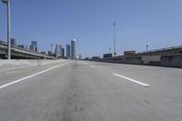 This is an image of a vibrant city skyline taken from a high vantage point. The architecture and skyscrapers create a striking cityscape against the clear sky. The asphalt road is captured in motion blur, conveying the fast-paced city life. The street lights illuminate the urban thoroughfares below, highlighting the urban design and infrastructure. This photo represents the hustle and bustle of a metropolitan area, with its straight-down-the-road perspective and lanes of traffic. It showcases the public spaces and road surfaces that form the backbone of city life.