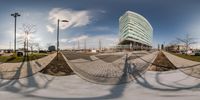 this is a photograph of a building in a city taken upside down with a fisheye lens