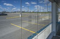 Urban landscape in Toronto, Canada. Clear skies contrast with glass-walled buildings and concrete streets. A composite material barrier and parking deck line the suburban road. A typical day in the city.