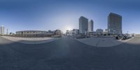 A bustling cityscape in Toronto, Canada. Modern architecture and high-rise buildings create a symmetrical pattern. Clear skies shine down on a thriving urban landscape. City life captured in a 360-degree view.