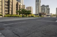 A view of a modern residential area in Toronto, Canada at dawn. The cityscape is illuminated by the break of day, with clear skies and yellow hues. The urban design showcases the sleek architecture and wide roads of the metropolitan area.