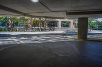 A vibrant cityscape of Toronto, Ontario during the day. The urban design features open spaces, buildings, and roads. The asphalt surface glistens under the shade of trees. A parking garage entry adds to the dynamic landscape.