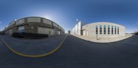 360 - vr image of buildings and road taken in front of them, with traffic lights on
