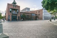 This stock photo features a stunning view of classic architecture in Los Angeles, California, USA. The photo captures the city at the break of dawn, with an open space plaza in the foreground. The clear sky and urban surroundings add to the charm of the scene. The cobblestone surface in front of a hotel and restaurant invites people to dine and enjoy the beauty of the city. Perfect for showcasing the vibrant and architectural side of Los Angeles, this photo is ideal for any project related to city life, architecture, or travel.