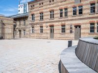 This image captures the essence of Berlin, Germany. It shows an empty courtyard outside an old building, with classic architecture and many windows. The courtyard has an open space design, with plants on the ground next to a brick wall. The clear sky above enhances the urban atmosphere. This photo represents the combination of history and modernity in Berlin's city life. It showcases the unique architecture and urban design that can be found in Europe's capital.
