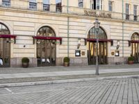 A classic architecture in the heart of Berlin, Germany. The hotel, Hotel Adlon Kempinski Berlin, stands proudly on the town square. The facade and arches beautifully line the cobblestone road, inviting visitors to explore the historic charm of the city. Perfect for dining, there are many hotels, restaurants, cafes, and bars in the area.