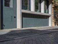 A classic architectural scene in Berlin, Germany. Cobblestone road lined with residential buildings casts hard shadows. Modern architecture blends with the city's urban design. A vibrant and lively residential area in the heart of Europe.