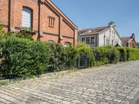 This image captures the bustling city life in Berlin, Germany. The classic architecture and cobblestone road create a charming and historic atmosphere. In the foreground, a brick path is lined with beautiful green bushes. The focal point of the scene is a large brick building in the center background. This photo represents the urban design and residential areas of Berlin, showcasing the unique blend of old-world charm and modern city living. The clear sky adds a sense of light and openness to the image, further enhancing the beauty of the city.