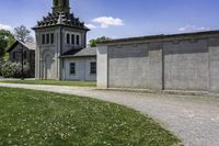 A classic architecture building in Ontario, Canada. The lush green landscape surrounds the historic castle. Clear skies highlight the tower and facade. A popular tourist attraction in the suburban area of Toronto.