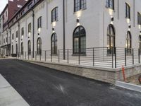 A classic architecture building stands tall on a quiet suburban street. Dawn breaks, casting a warm glow on the facade. A bicycle leans against the wall, beside a bicycle rack and a street light.