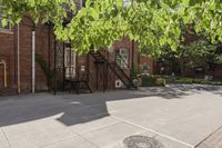 This photo showcases the beauty of classic architecture in Toronto, Canada. The image features an old brick building with a staircase and sidewalk on both sides of a street. The sidewalks are adorned with plants, adding a touch of nature to the urban setting. The surrounding area is a residential neighborhood, with houses and properties lining the road. The street is made of concrete and the road surface is well-maintained. The photo was taken during the day, capturing the vibrant city life. The image also highlights the urban design and public spaces in Toronto, including a courtyard and an alley-way. The photo perfectly captures the essence of the art district in Toronto. The Hinterhof, a small road adjacent to the main street, can also be seen in the background. Overall, this image represents the charm and beauty of Toronto's classic architecture and urban landscape.
