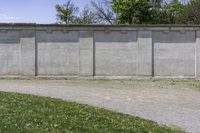 a cement wall next to a sidewalk with grass and trees in the background of the wall is filled with weeds