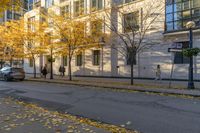A modern residential building in Toronto, Canada. The classic architecture stands out against the clear sky. Yellow leaves cover the trees lining the asphalt road, giving a hint of autumn in the city.