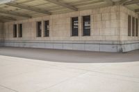 This is a photo of a classic architecture office building in a business district. The building has a concrete facade with large windows and a rooftop walkway. The surrounding area is a well-maintained urban plaza with open spaces and walkways. The clear sky with fluffy clouds provides a beautiful backdrop to the scene. This photo represents the combination of residential and business structures in a suburban setting, creating a harmonious blend of functionality and aesthetics.