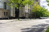A beautiful view of classic architecture in Berlin, Germany. The photo showcases a road with asphalt, leading to a bus stop. It is a sunny day, highlighting the beauty of the European city. The architecture in Berlin is known for its charm and elegance.