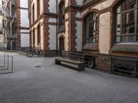 a bench sits in the middle of a courtyard with parked bicycles nearby and tall brick buildings