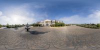 Aerial view of a residential area in Los Angeles, California. The low-lying building features classic architecture and a white facade. The driveway is lined with bougainvillea, leading to the entrance of the home. The clear sky and sunshine add to the inviting atmosphere.