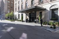 three people in suits standing outside the entrance to a large hotel or apartment building with an awning