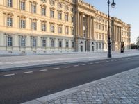 This image showcases a classic architecture building with windows and lights, located in Europe, specifically Berlin, Germany. The road, made of asphalt, is seen in the distance. The clear sky adds to the beauty of the urban design. This photograph captures the essence of city life at dawn. The combination of the architectural elements and the urban atmosphere make this scene unique and representative of European cities. The building may be a museum or a residential area. Overall, this image portrays the charm of classic architecture in an urban setting.