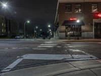 Classic architecture meets urban nightlife in a charming low-lit town. Reflections from streetlights illuminate the road and crosswalks. Restaurants and bars create a vibrant atmosphere for dining out after dark.
