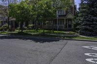 This stock photo features a street view of houses on the corner in the suburbs of Toronto, Ontario, Canada. The classic architecture of the buildings stands out against the clear sky backdrop. Lush vegetation, including trees and landscaping, adds to the charm of the residential area. The road surface, with its well-maintained asphalt, provides easy access to the houses. This image captures the urban design and residential feel of the neighborhood.