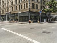Classic architecture and palm trees line the streets of downtown Los Angeles. Urban design meets vibrant city life, with bustling restaurants and crosswalks. A sunny day adds to the vibrant atmosphere.