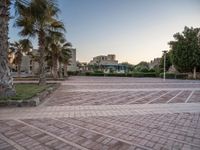 Classic architecture in residential area of Egypt at dawn. Palms and clear sky create a serene urban landscape. Open spaces with palm trees and pavers complement the timeless architecture.