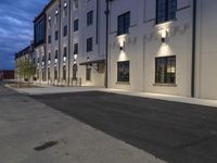 A classic architecture residential building with a grand facade illuminated by street lights at dusk. The cloudy sky adds drama to the urban design of the city. Dark Armco barriers line the road.