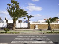 A classic residential building in Fuerteventura, surrounded by palm trees and located in a peaceful neighborhood. The town's rural charm is enhanced by the clear blue sky and the profile of the nearby island.