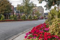 This image showcases the classic architecture and residential buildings of a suburban neighborhood in Ontario, Canada. The view captures a gloomy autumn day with a grey sky overhead. The foreground features a road surface flanked by trees and vegetation, adding a touch of color with magenta flowers. The charming windows and shrubs of the houses create a picturesque scene. The photo represents the real estate and serene ambiance of this suburban area. This is the perfect image to depict the beauty of a tranquil neighborhood in Toronto or Niagara.
