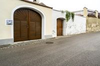 a narrow road leads to a white house and door with a wooden handle and a metal pole on one side