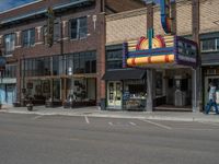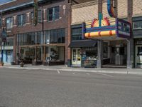 A classic architecture storefront in a small rural town in Utah. The road lined with asphalt leads to the charming shops and stores. Clear skies and fluffy clouds set the scene for a picture-perfect day.