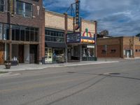 A classic architecture storefront in a rural town in Utah, USA. The road leads to a shopping area with various stores. Clear skies and urban design create a picturesque scene.