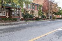 A gloomy autumn day in Toronto, Canada. Classic architecture lines the suburban streets of Ontario. Grey skies cast a somber mood over the residential neighborhood. Tree-lined roads and asphalt create a picturesque scene.