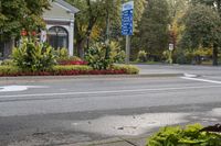 Classic architecture and suburban streets of Toronto, Ontario. Grey sky sets a gloomy autumn mood. Vibrant tree leaves and shrubs contrast against the asphalt road surface. A stop sign stands near a planter bed and blue signs.
