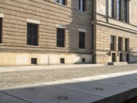 A man walks down the sidewalk of a classic Berlin street lined with old brick buildings. The yellow facade and hard shadows create a striking urban design. In the heart of Europe's business district, this area boasts a mix of modern and classic architecture.