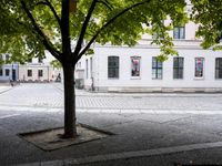 This photo captures the beauty of classic architecture in Berlin, Germany. At the corner of a cobblestone street, there is a bench under the trees, providing a peaceful spot in this charming European city. The architectural details of the nearby houses and buildings add to the historic charm of the neighborhood. It is the perfect place to explore and experience the vibrant city life of Berlin on a sunny day.