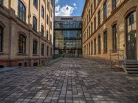 Urban architecture in Berlin's city center. Classic brick walls and cobblestone streets contrast with modern office buildings. A bustling business district with open spaces and storerooms. European city life in a historic European city.