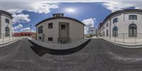 A street in a suburban residential area, with modern architecture and classic brickwork. Clear sky and sunny weather enhance the vibrant colors of the neighborhood. Trees and vegetation line the road, creating a peaceful and picturesque scene.