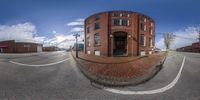 A fisheye view of a classic office building in Kingsport, Tennessee. The grey sky sets the tone for the business district. Brick walls and asphalt roads line the urban landscape. Street art and graffiti add a touch of art to the concrete surroundings.