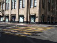 A classic office building in the heart of Los Angeles. The yellow lines on the asphalt create a striking contrast against the urban design. The crossing is a symbol of city life in bustling California.