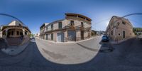 A fisheye view of a road in Mallorca, Balearic Islands. Residential houses line the street, while buildings stand tall in the distance. Clear skies and a clear day showcase the beauty of this European island.