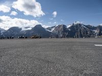 a parking lot with parked cars next to mountains with snow capped peaks in the background