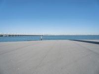 A serene coastal landscape in the Netherlands. Clear sky above the open space with wind turbines and a windmill in the distance. The road leads to a pier and jetty, offering stunning views of the ocean and horizon.