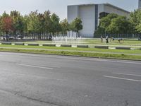 A person rides their bike down an asphalt road in Berlin. Modern architecture and urban design surround them, with a water fountain flanked by statues. Clear sky adds a touch of serenity to this European cityscape.