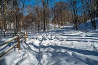 a snowy path in the woods with lots of snow on the ground and a wooden railing