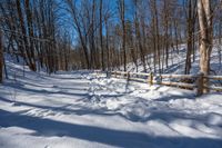 a fence next to some snow in the woods'' and a path leading them in some very deep snow