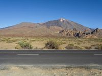 This image showcases the rural landscape of Tenerife, Spain in the Canary Islands. A road surface stretches into the horizon, bordered by grass and vegetation. The low mountains and national park in the background create a stunning natural backdrop. The clear sky adds to the serene and picturesque scene. This photo captures a typical day in the rural areas of Tenerife, surrounded by the beauty of nature.