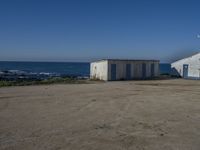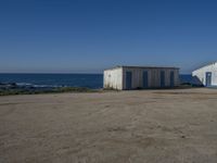 This stock photo showcases a breathtaking coastal landscape in Portugal. The clear sky above highlights the beauty of the sandy coastline and the sparkling blue waters of the ocean. In the foreground, there is a house with a charming door and windows, surrounded by an open space with a dirt and gravel surface. The horizon stretches out, creating a sense of vastness and tranquility. This image perfectly captures the natural beauty of Portugal's coastline and the serene atmosphere of a clear sky day.