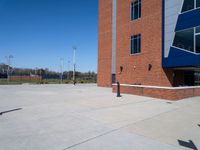 An empty courtyard near an intersection, featuring a concrete surface and an American flag. Clear sky enhances the open space. A perfect day for a game of football in the stadium nearby.